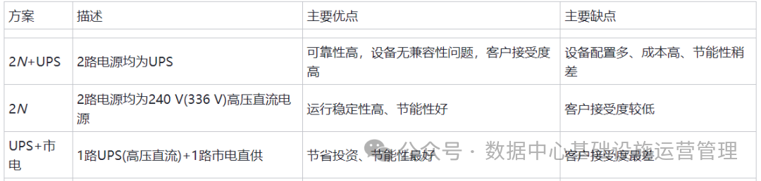 IT设备供电系统的主要功能是为机房的IT设备提供不间断、高品质的电源保障。参考GB 50174—2017《数据中心设计规范》的相关规定[1],数据中心机房可划分为A、B、C 3类。本文所讨论的类型仅限于A类机房,根据标准的要求,不间断电源宜采用2N或N+1配置。数据中心常见的供电类型如表1所示。