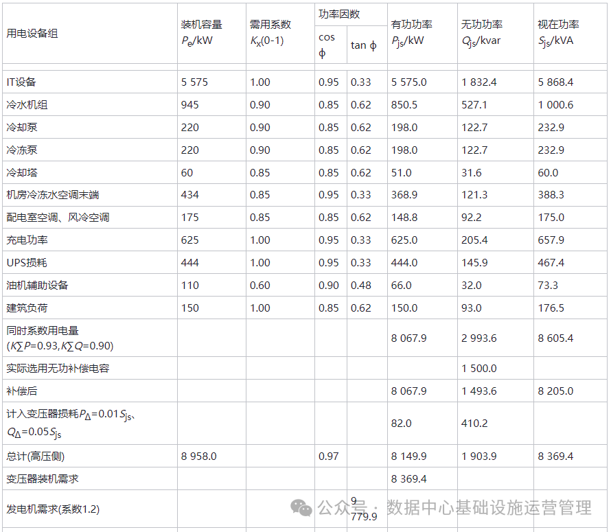本项目数据中心拟建1 204个服务器机柜。单机柜功耗取5.5 kW,同时系数取0.8,UPS输出功率因数按0.9配置,最大负载率取80%,蓄电池后备时间为0.5 h, 各层各类机房负荷确定如下。